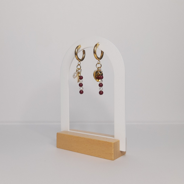 RVS oorringen met hartje, bordeauxrode kralen en imitatie zoetwaterparels