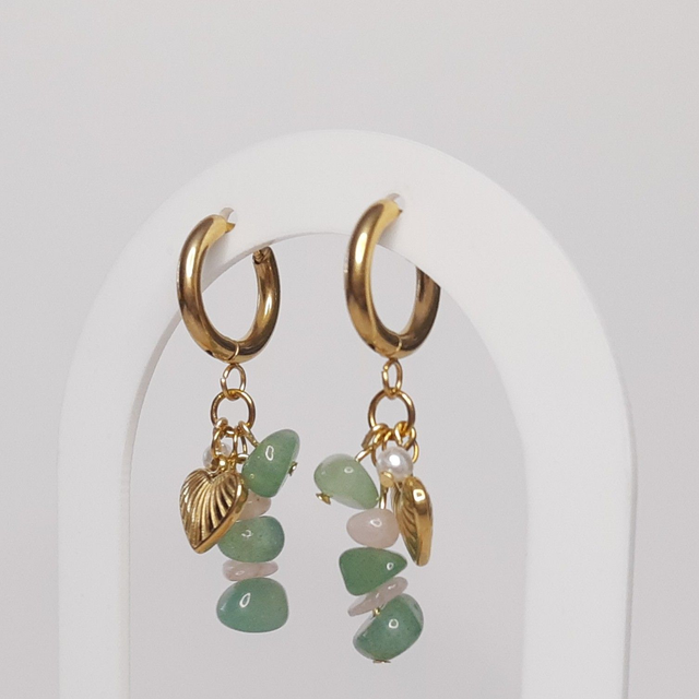 RVS ringetjes met roze/groene natuurstenen, een RVS hartje en een lief pareltje.